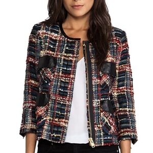 Stylish Smythe tweed plaid jacket featuring leather accents. Perfect for adding a chic touch to any outfit.