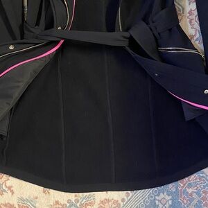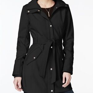 Stylish black trench coat with hood. Fleece lined, very warm. Belted at the waist. 32 inches long. Slightly longer in the back. I have only worn this coat a few times. I do like it a lot, it just doesn’t get cold enough where I live to wear it often. I feel bad it just sits in my closet.