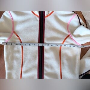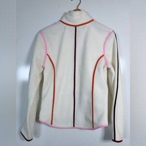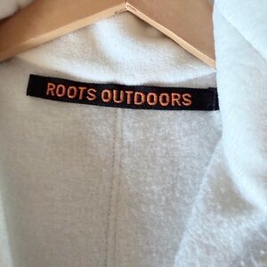 Stylish Roots sweatshirt. White with pink, deep red, and orange piping. Full zip-up front. Comfortable and chic.