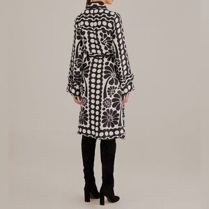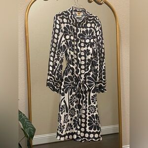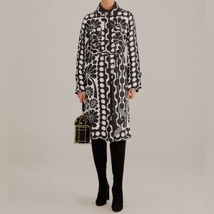 Chic midi dress with bold black and white pattern. Button-up front with collar. Long sleeves and belted waist. Perfect for stylish outings.