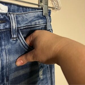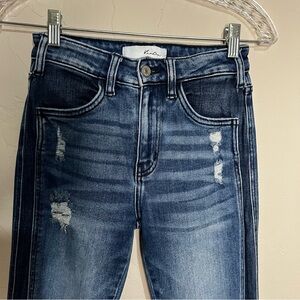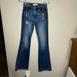 Kancan Morgan High Rise Flare Two Tone Raw Hem Flare Distressed Denim Jeans