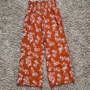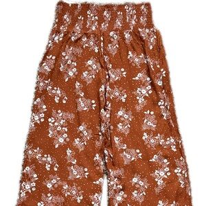 Pull on pants that are perfect for summer! Lightweight, flowy, with a floral design to give that boho chic style. Features wide loose leg, wide elastic waistband, two front pockets. Rust colored with white floral design. New with tags, smoke free environment.