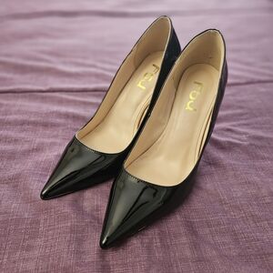 Custom extra wide size black pumps featuring bold red soles. Two pair available