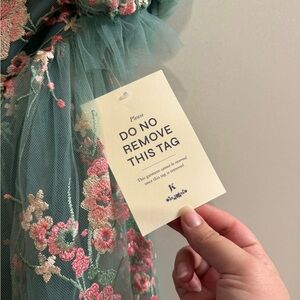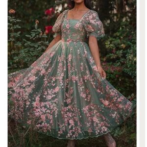 Elegant midi dress with floral pattern. Features green base with pink blossoms. Total Bridgerton vibes! Perfect for special occasions.