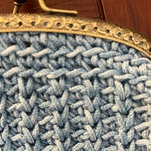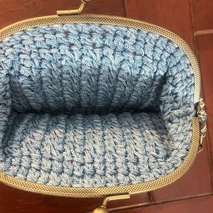 This elegant blue crochet handbag features a charming design with a gold-tone frame and chain. Perfect for adding a touch of sophistication to any outfit. Design: A crochet or woven fabric body with a metallic frame. The texture is consistent with handmade crochet styles often referred to as "clic clac" or "kiss-lock" pouches. 6” x 7” Chain drop 6”