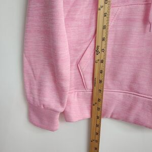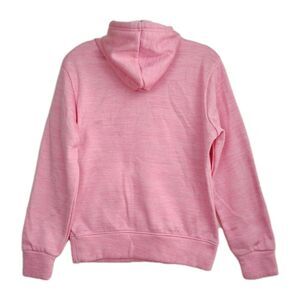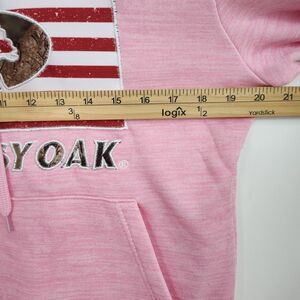 The Mossy Oak Hoodie Sweatshirt for women in size Small features a pink color with a large flag logo embroidered on the front. This pullover hoodie is made of 100% polyester knit fabric, making it comfortable for activewear occasions. It has a drawstring closure, long sleeves, and a hood for added warmth. The hoodie also includes pockets for added convenience. Perfect for those who love the outdoors and want to show off their patriotic spirit in style.