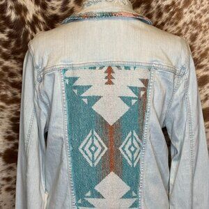Upcycled Distressed Western Jean Jacket Soft Multi Aztec Wool Accents -L