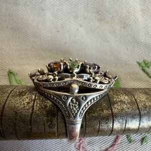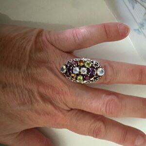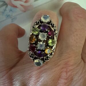 This stunning silver ring features a vibrant array of gemstones, including purple, green, and yellow. Perfect for adding a touch of elegance to any outfit.