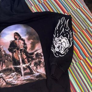 Darc sports double side 86 of 1000 size large kangaroo pocket graphic logo front and back and sleeve hits super nice piece high-quality material Black hoodie featuring a grim reaper and wolf design. Unique artwork on the back and sleeves. Top to bottom measurements are. 29 inches pit to pit. 24 inches I am liquidating in my closet. Take advantage, beautiful piece.