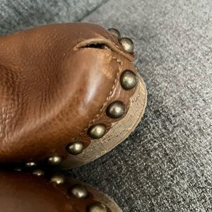 Elegant brown leather mules with studded detailing. Perfect for stylish comfort.