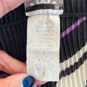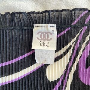 Vintage C.O.C. USA plissé top featuring a bold black, purple, and white striped pattern. Effortlessly chic micro-pleated texture with a comfortable stretch fit.
