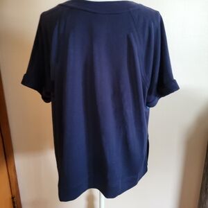 Short sleeve navy blue cotton terry sweatshirt tee with 4 colorful retro textured stripes across the front. Cuffed sleeves, side split hem, boxy cut. New with tag, never worn! Cotton poly blend. Size large. Pit to pit 23".
