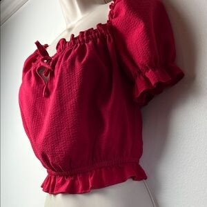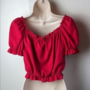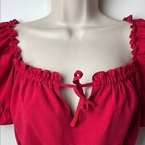 Cute milkmaid puff sleeve ruffled peasant crop top blouse in tomato red woven seersucker fabric, like a red coral colour. Can be worn on or off shoulders. Fits true to size. Model photo shows fit, note that the one for sale here is red.