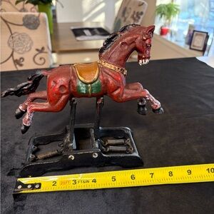 Heavy cast iron construction with hand-painted brown finish, red saddle, and green blanket.