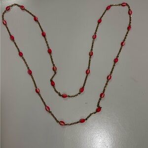 This stunning necklace features a delicate gold chain adorned with vibrant pink/white beads. Continuous chain with no clasp, approx 52” in length. Perfect for adding a pop of color to any outfit.