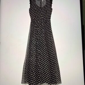 Elevate your wardrobe with this chic black and white polka dot midi dress. the pleated silk neckline and organza body make you feel like you’re floating. Perfect for any occasion, its timeless design offers both style and comfort. Feel like a queen in this dress!