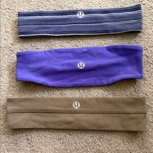 Lululemon headbands in navy, violet, and khaki. Perfect for active wear.