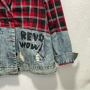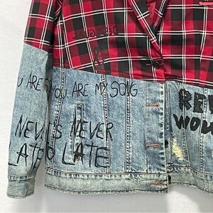 Desigual Woman - Denim and Checks dual-fabric blazer Straight-fit blazer. Dual-fabric garment in denim and tartan-inspired red checks. Handwritten messages print appears in black. The blazer lapels framing the V-neck are red and black tartan too. Description Women's dual-fabric blazer, created in blue denim and red tartan fabric Approx Shoulders 17” Pit to pit 21” Length 25”