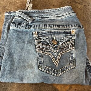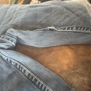 Classic blue denim with intricate stitching. Ideal for everyday style. Back of legs worn and loose stitching on leg (see photos)