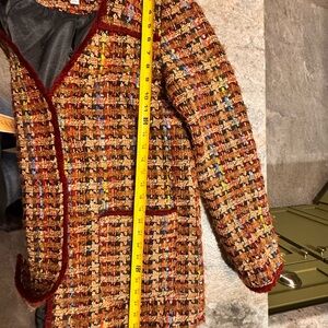 Chic tweed blazer with rich burgundy trim. Vibrant multicolor pattern. Perfect for stylish layering. Fully lined, perfect condition. Great for spring