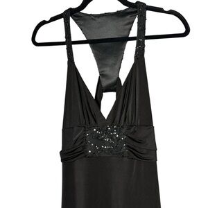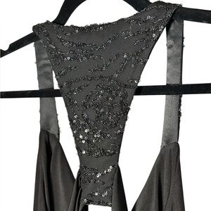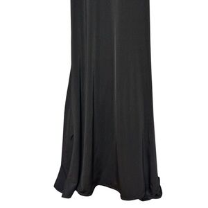 This exquisite black gown by Jessica McClintock is designed for cocktail nights, featuring a sophisticated halter neckline and a backless design. The sleeveless silhouette drapes elegantly, offering a timeless and chic look for any evening affair.