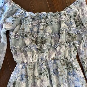 baltic born, florence dress, floral maxi, sage floral, cottagecore dress, boho maxi, wedding guest dress, garden party, romantic dress, smocked bodice, off shoulder dress, spring dress, summer maxi, feminine dress, flowy maxi, bridesmaid alternative, modest dress, pastel floral, Easter Dress
