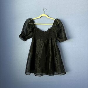 Mable Medium Black Puff Sleeve Square Neck Babydoll Mini Dress Smocked Tulle GUC