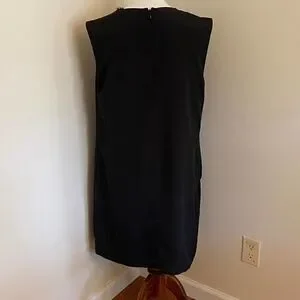 Black sleeveless shift dress. Double layer chiffon. Beading along neckline. Hidden side seam pockets. Delicately draped pleating. Relaxed fit. Great to transition from a formal event to a night out. Little black dress. LBD.