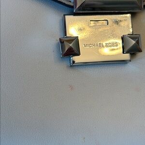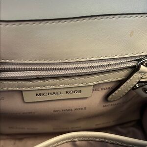 Elegant Michael Kors Whitney satchel in a beautiful light gray leather with silver-tone hardware. This structured handbag features a top handle and detachable/adjustable crossbody strap for versatile wear.