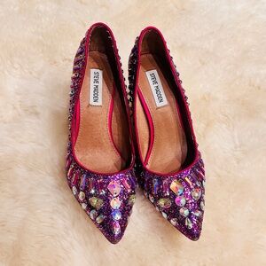 Turn heads in these bold and dazzling Steve Madden Galaxxie pumps in women's size 8M. Covered in vibrant fuchsia glitter with striking iridescent rhinestone embellishments, these statement heels feature a pointeo toe and a slim stiletto heel for a sky-high glam look. Perfect for parties, special events, or any moment that calls for sparkle.