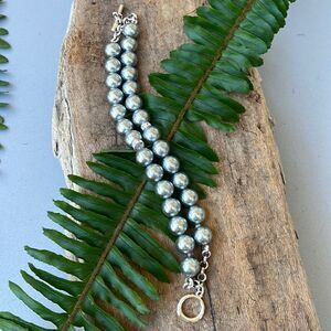 A beautiful bracelet with a double strand of gray freshwater pearls with silver hardware and two small crystal decorative bands.