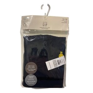 Baby Gap organically grown cotton snug fit pajama set. This set includes a navy long sleeve top with a small yellow bear embroidery and three button placket, along with matching plaid pants. The set is packaged in its original clear plastic with tags attached.