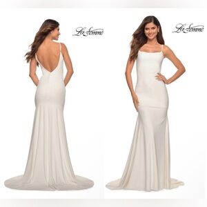 This gorgeous La Femme dress is a show stopper!! It is classy, chic and timeless and such a great dress for any upcoming formal event! It features a jaw dropping low cut back that is absolutely stunning!!! The neckline is effortless and classic, leaving the back the star of the show! The silhouette will glide to your body and curves highlighting your most flattering figure! This dress is current season, 2023 and is selling for full price- get is here for a steal, brand new & never worn in pristine condition!