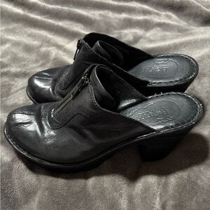 BORN Black Leather Front Zipper Mules