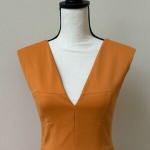 Chic high quality fit and flare midi dress by Tibi. Warm orange tone. Sleeveless with a v-neckline. Beautiful back cutouts.