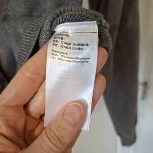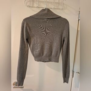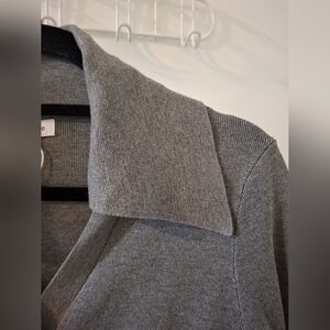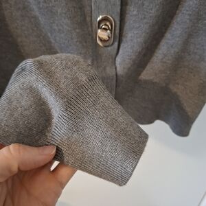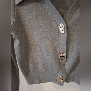Beautiful dark gray cropped cardigan with unique silver hardware twist knob closures; features fun details that give an elevated flair to a wardrobe staple; contemporary with retro inspired elements; exaggerated wide lapel point collar; super soft viscose blend; ribbed at cuffs and hem; my home is smoke-free