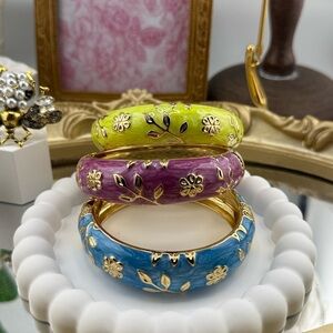 Elegant floral enamel bangles in vibrant purple, blue, and green hues. Perfect for adding a pop of color to any outfit.