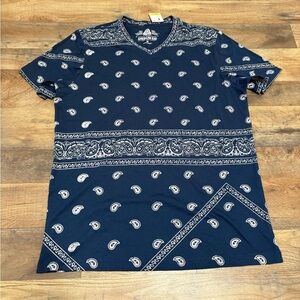 #AmericanRag #BandanaPrint #PaisleyTee #StreetwearStyle #MensGraphicTee #VNeckShirt #FestivalOutfit #UrbanStyle #SizeMedium #NavyBlue #CasualCool #BelowRetail