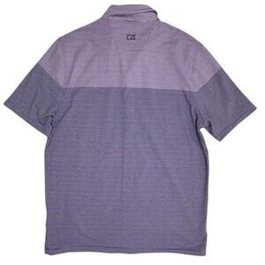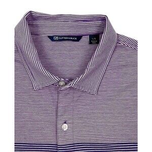 Cutter & Buck Pioneer Engineered Stripe golf polo in Majestic purple. Cotton-rich CB DryTec Cotton+ fabric has a more substantial feel than typical performance polos, with comfortable stretch. Full button front gives it a polished polo-shirt hybrid look. Features side vents/split hem and UPF 50+ sun protection. Terrific pre-owned condition.