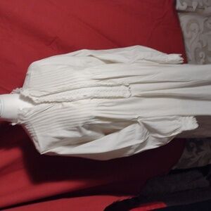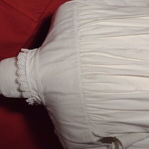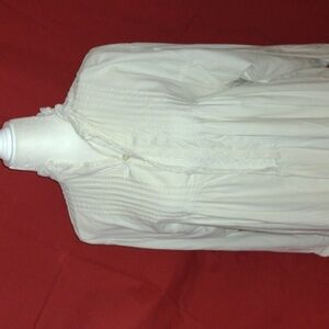 All muslin cotton. Lovely tucked front panel. The lace on the neck and wrists had to be replaced eventually in about 2002. The beautiful front placket is original. Maybe Belgian or French. Beautiful hand stitching on the cuffs. Double stitching on the arm, side seams and bodice. Inside tag with owner's initials L.W. The buttons are not original.