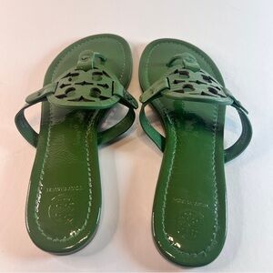 Classic Tory Burch Miller sandals in a bold glossy green patent leather. Features signature laser-cut logo medallion and comfortable flat thong style — perfect statement neutral for spring & summer outfits.