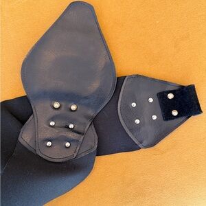 Make a bold statement with this gorgeous vintage black wide stretch belt, featuring an incredible silver-tone metal swirl horn embellishment at the front. The sculptural horn detail hooks into the opposite end for a striking, artistic closure that feels both edgy and timeless.