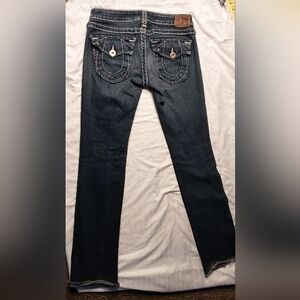 Stunning True Religion Joey Super T jeans featuring the iconic oversized white contrast stitching. These are the classic Made in USA quality with the signature horseshoe flap back pockets and branded silver-tone hardware. The fit is a flattering low-rise flare with a stylish raw hem. Perfect for a 2000s/Y2K-inspired look.
