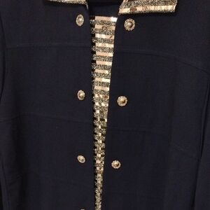 This sophisticated blazer combines a sleek black body with a striking gold-accented collar, featuring a unique striped pattern. The tailored design and textured fabric make it a standout piece for any formal occasion.