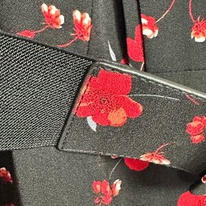 Chic black midi dress with striking red floral design. Sleeveless with a belted waist. Ideal for stylish outings.