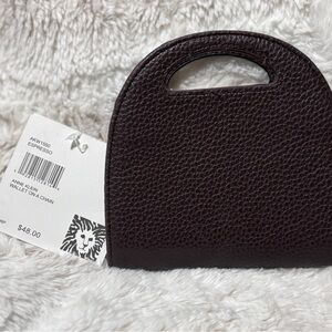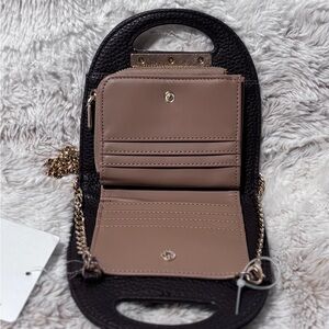 Elegant Anne Klein Wallet on a Chain in espresso. Features a stylish gold chain. Perfect for versatile use. Little bit of pulling on the stitching on the brown part of the strap, as shown in picture. NWT.