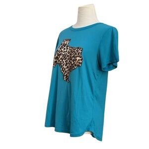 Southern Grace hi-lo short sleeve teal blue t-shirt with textured Texas leopard print outline. Soft cotton/polyester blend.