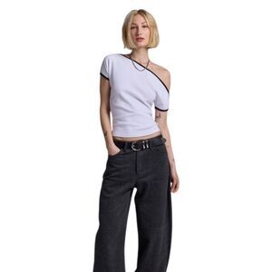 Modern minimal BDG top in a slim & cropped fit. Designed in a soft cotton knit featuring an asymmetrical off-shoulder neckline, cap sleeves and contrast trim. Find it only at Urban Outfitters.