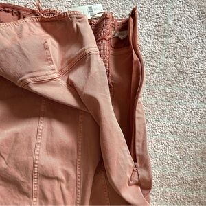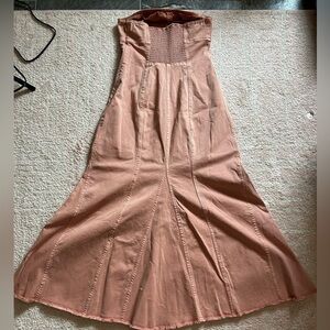Dusty pink Denim Midi Dress. Color is Coral. Closest in color to the model photo. Fluted silhouette. Smocked back panel. Side zip (zipper is a bit stiff). Strapless, silicone strip at bust.