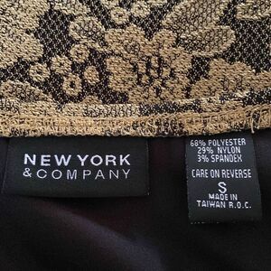 New York & Company stretchy gold and black floral lace skirt with black lining. In good condition!